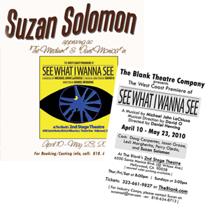 “Suzan Solomon as the medium in Act I also merges brass and pathos as “Glory Day’s” atheist aunt” -David Nichols, LA Times Theatre Beat